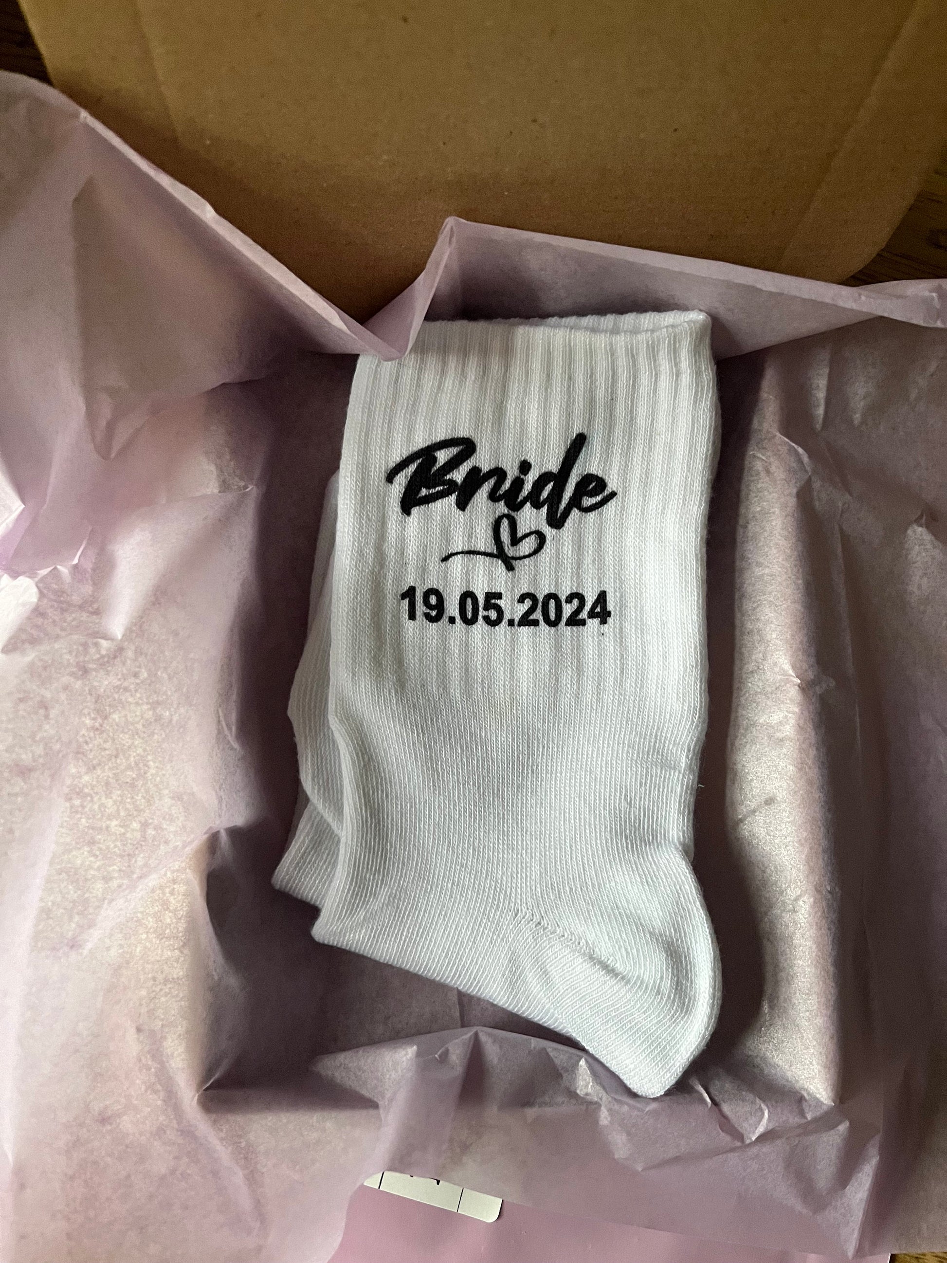 Bride Wedding Day Socks, have the whole wedding party matching, with these special keepsake socks, printed with wedding role and name. We can also add a date too, just let us know. Wear these comfy sports style socks the morning of the wedding or as part of a hen weekend or show off your newly married status on your honeymoon. Wedding role will be printed with your drop down choice. Design on outer of both socks.
