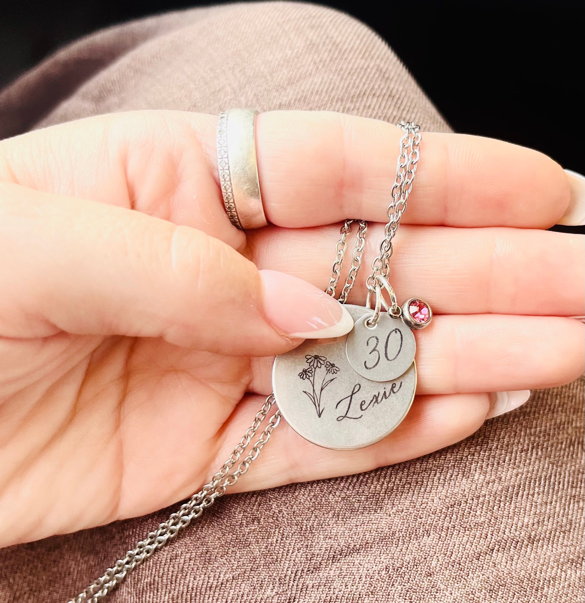 Engraved Birthstone Necklace with Name and age, Charm Necklace Personalised