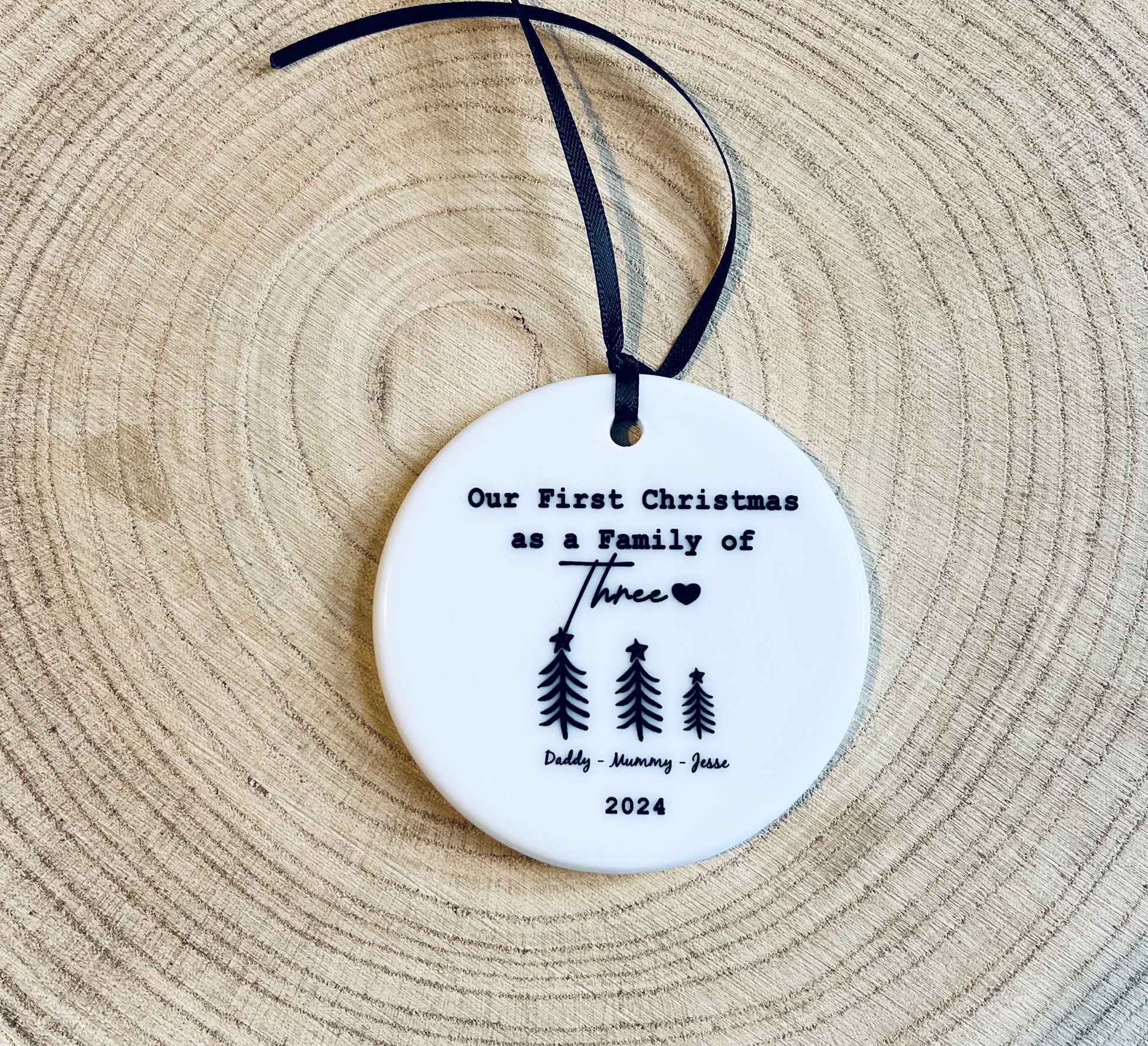 First Christmas As a Family of Three Ceramic Bauble, Personalised New Family Gift, First Xmas, Baby First Christmas Keepsake Gift, Tree