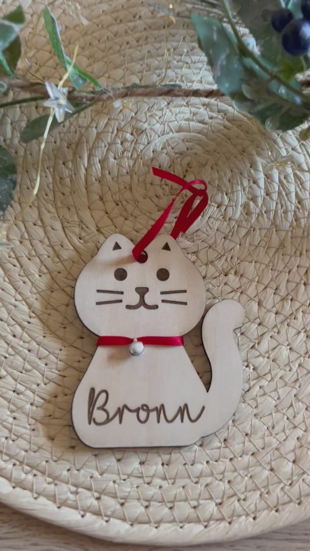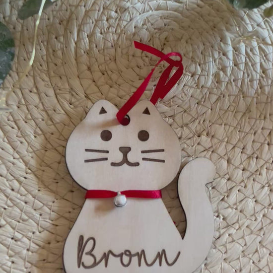 Personalised Wooden Cat Shape Bauble with Ribbon & Jingle Bell, personalised with name of choice