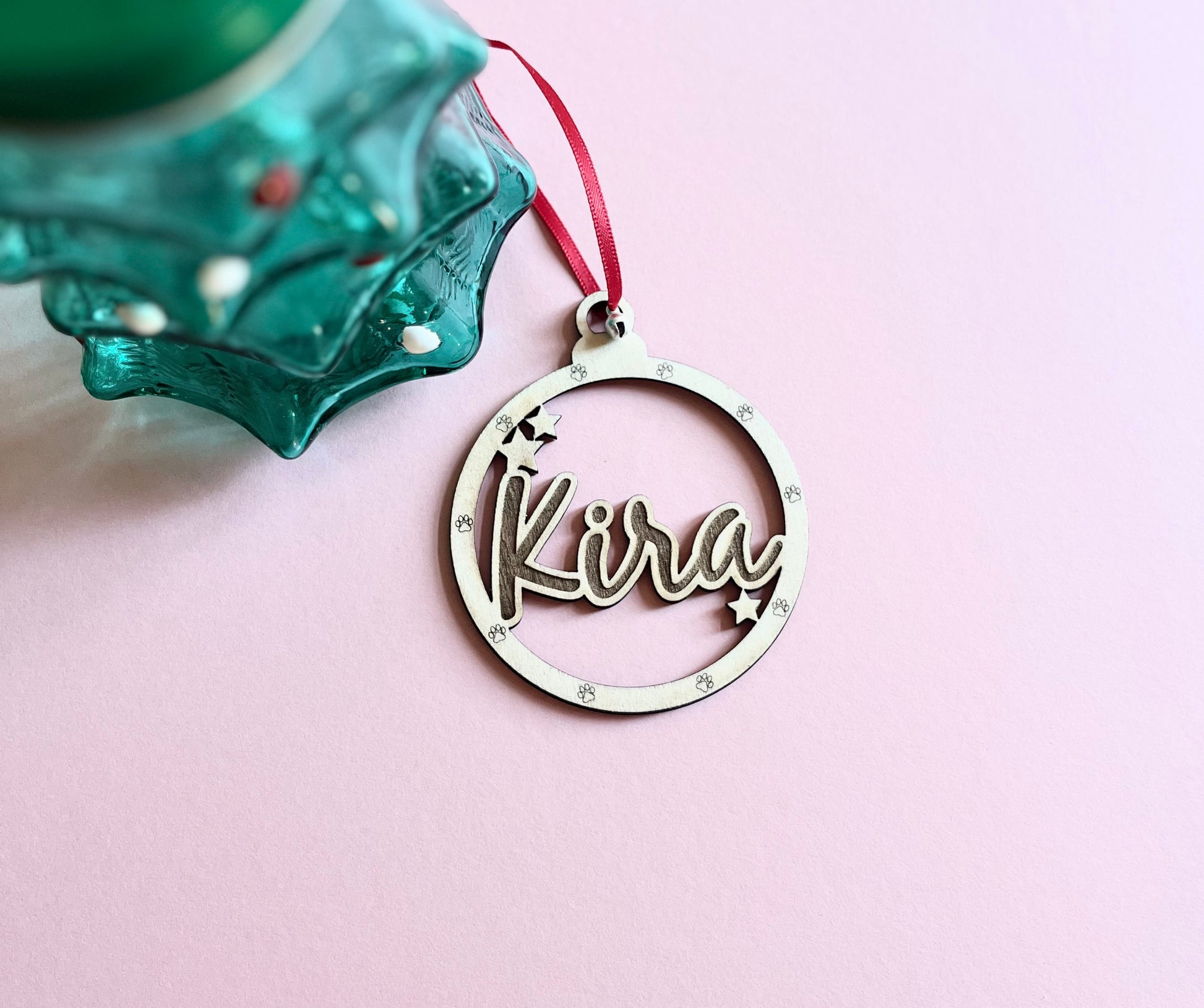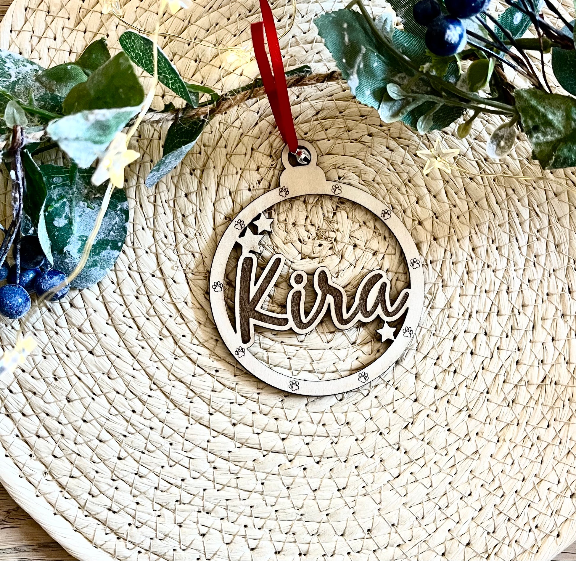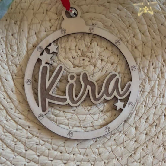 Personalised Paw Print Dog Decoration with Name, Dog Mum Gift, Cat Mum Gift, Dog Bauble for Tree, Wooden Pet Memorial Sign, Dog Bauble