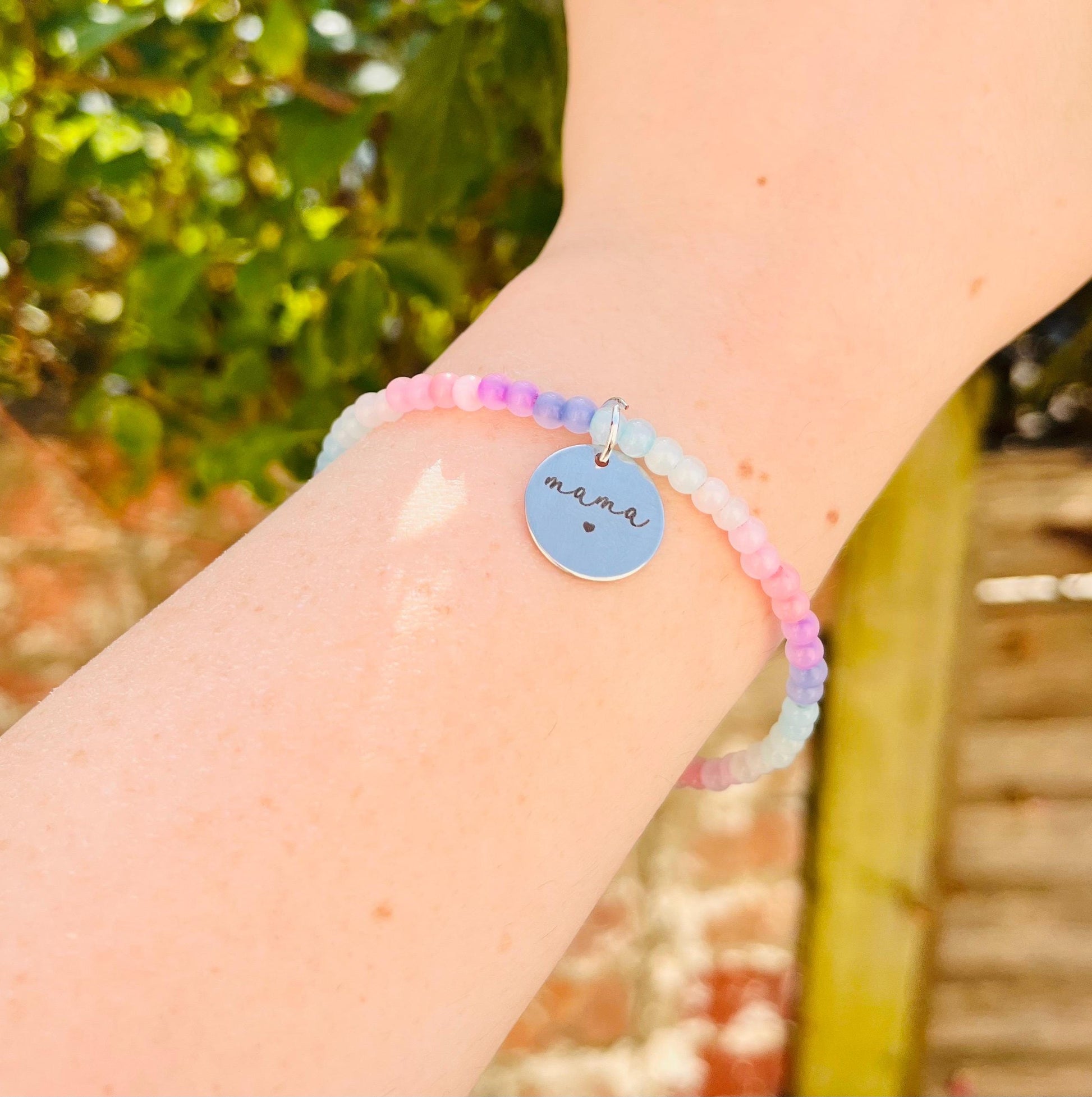 Rainbow Bracelet with Engraved Silver Tag – Personalised Gift, Pride Jewellery, Colourful Charm Bracelet Add a splash of colour and a touch of meaning to your style with this vibrant Rainbow Bracelet, featuring an elegant engraved silver tag. Handcrafted with love, this bracelet is the perfect blend of fun and sophistication — whether you're celebrating Pride, gifting someone special, or simply brightening up your day. Strung with high-quality rainbow-colored beads for a cheerful, eye-catching look Includes a customizable silver tag – engrave a name, date, or word