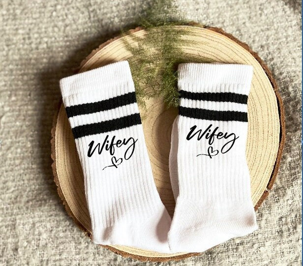 Wifey Wedding Day Socks, have the whole wedding party matching, with these special keepsake socks, just let us know. Wear these comfy sports style socks the morning of the wedding or as part of a hen weekend or show off your newly married status on your honeymoon.